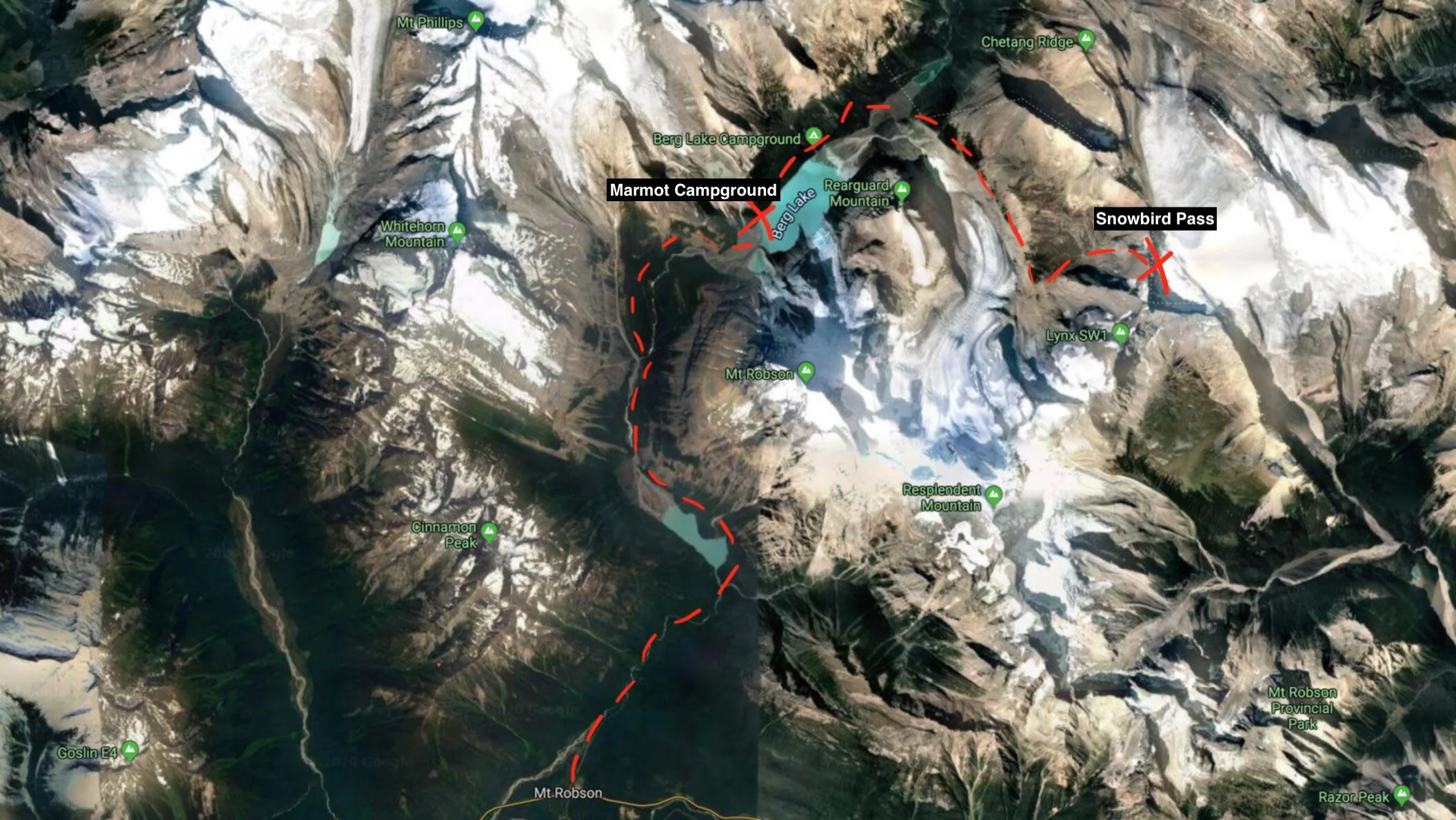 Climbing steadily we crossed a wide meadow with lots of active marmots and started our final push to reach Snowbird Pass in the late afternoon. The scenery was stunning and of course it was all worth it! We were awarded with spectacular views of the Robson Glacier, a beautiful alpine valley, and the enormous Reef Icefield beyond the pass. Looking across the vast expanse of ice separating British Columbia and Alberta, we took a well-deserved rest and quietly contemplated our achievement.